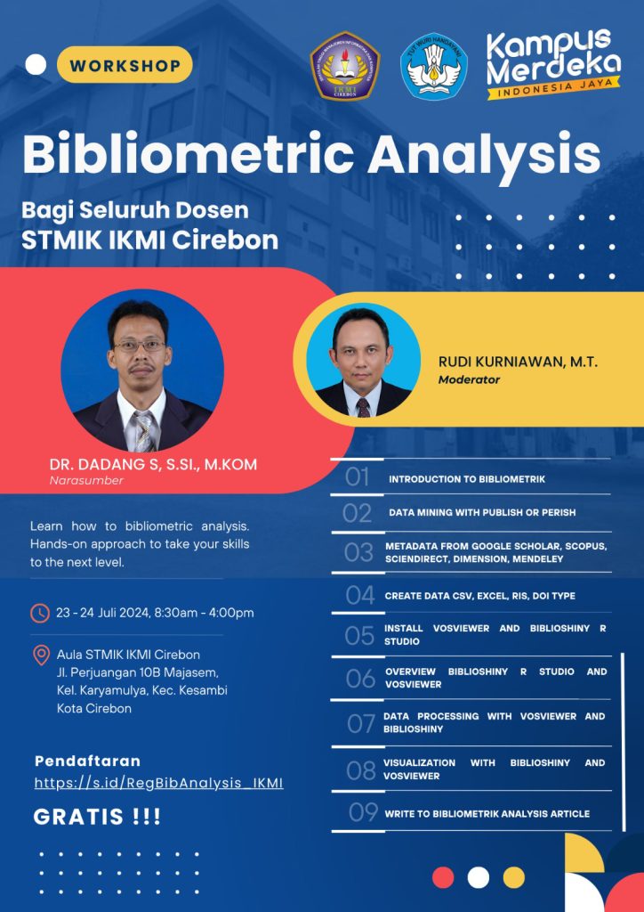 CIREBON, IKMI.AC.ID – Dalam rangka meningkatkan kompetensi dosen di bidang riset dan penelitian, STMIK IKMI Cirebon menyelenggarakan workshop Bibliometric Analysis pada tanggal 23-24 Juli 2024. Workshop ini diikuti oleh 30 dosen dari STMIK IKMI Cirebon dengan narasumber Ketua STMIK IKMI Cirebon Bapak Dr. Dadang Sudrajat, S.Si, M.Kom.
